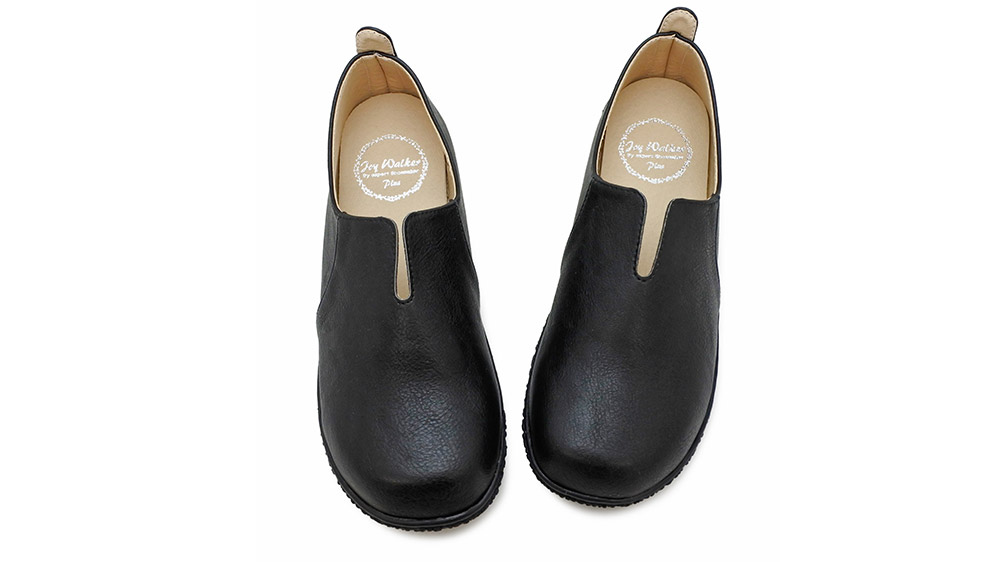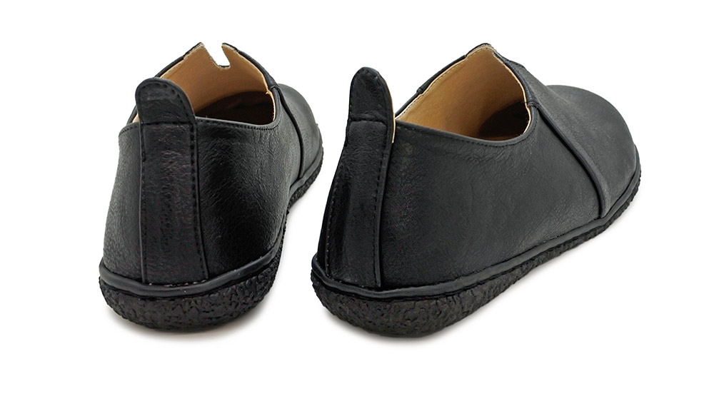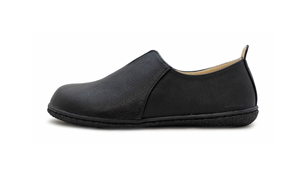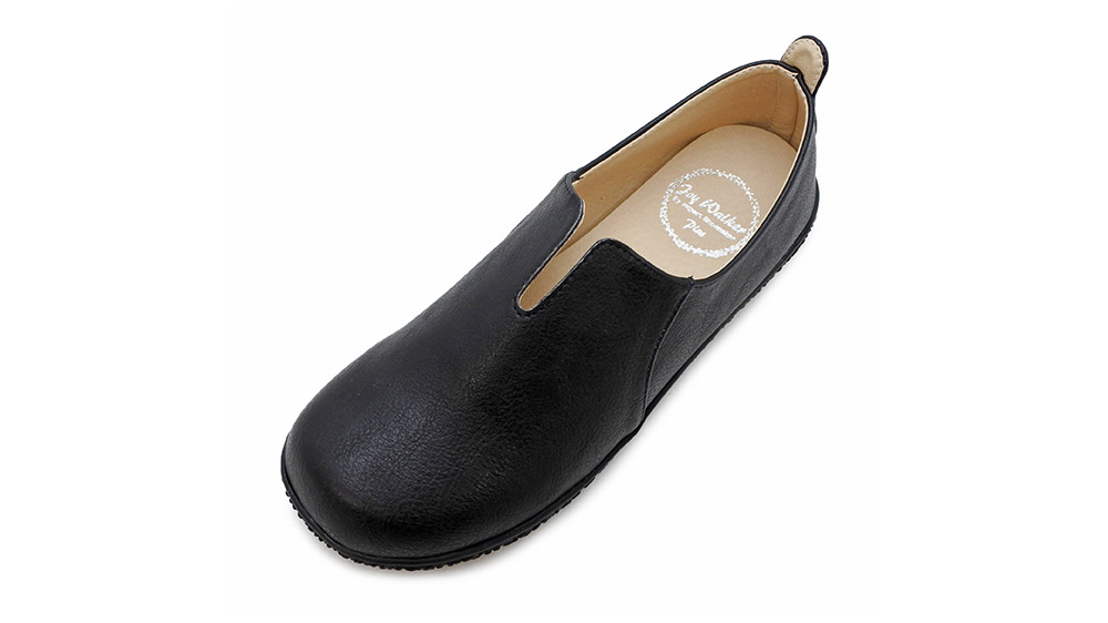 甲のVカットと かかとのタグをアクセントにあしらい、脱ぎ履きしやすい作りとなっています。インソールがふかふかしていて気持ちよく、足全体がやさしく包み込まれている感覚。つま先部分は広くゆるやかなアーチで、指先を締め付けずゆったりリラックスして履いていただけます。カジュアルにもきちんとした装いにもマッチするデザインです。