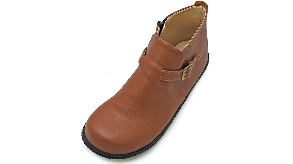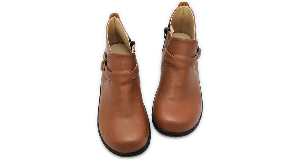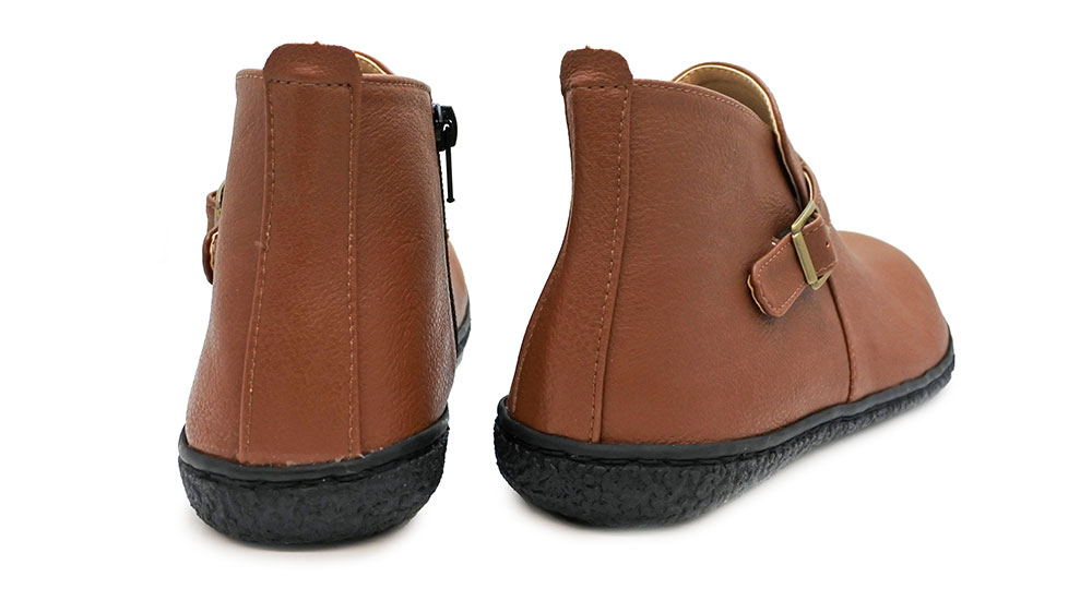 アッパーは質感の良い合皮素材で、柔らかく履き心地が良いです。3段階調節できるベルトとサイドファスナーがアクセントに。インソールもふかふかしていて気持ちよく、足全体がやさしく包み込まれている感覚。つま先部分は広くゆるやかなアーチで、指先を締め付けずゆったりリラックスして履いていただけます。 短めの丈なので、スカートにもパンツスタイルにも合わせやすく、靴下とのコーディネートも楽しめます♪